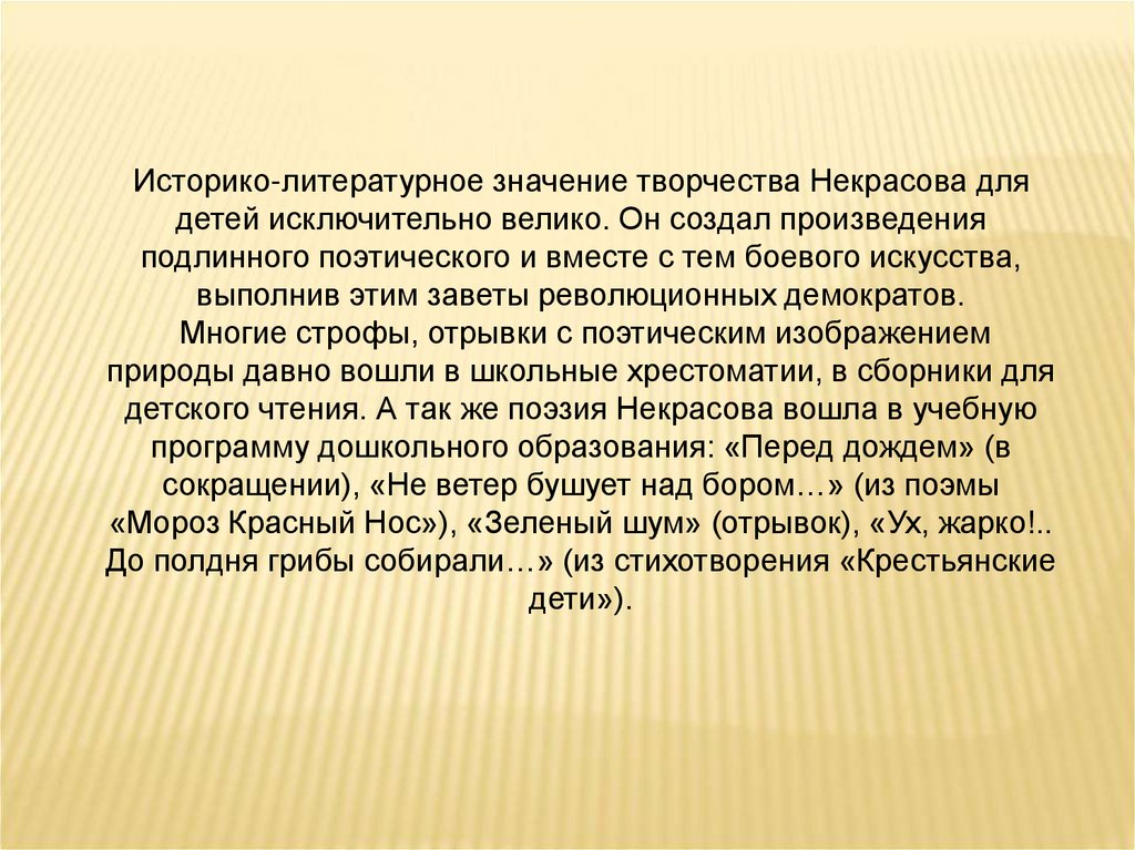 Историко-литературное значение творчества Некрасова длядетей исключительно велико. Он создал произведения