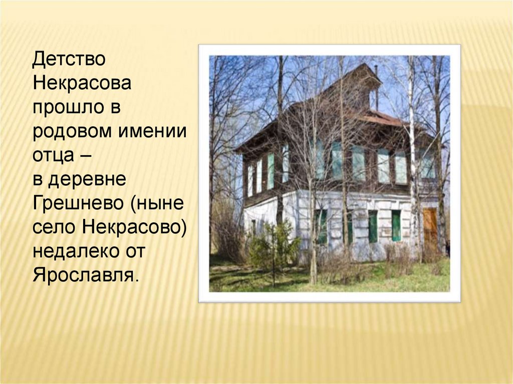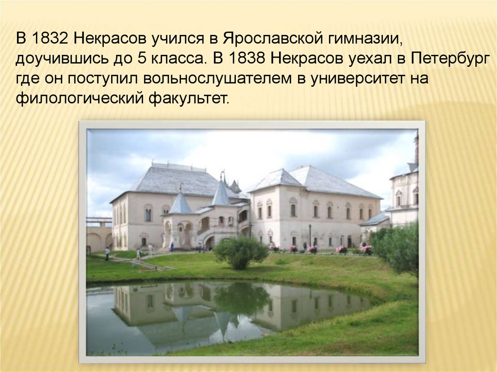 В 1832 Некрасов учился в Ярославской гимназии,доучившись до 5 класса. В 1838 Некрасов уехал в Петербург
