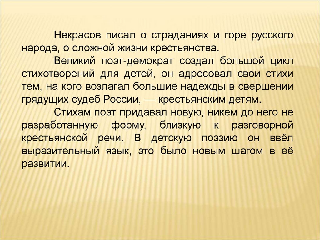 Некрасов писал о страданиях и горе русскогонарода, о сложной жизни крестьянства.