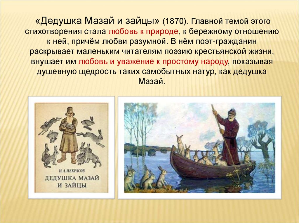 «Дедушка Мазай и зайцы» (1870). Главной темой этогостихотворения стала любовь к природе, к бережному отношению