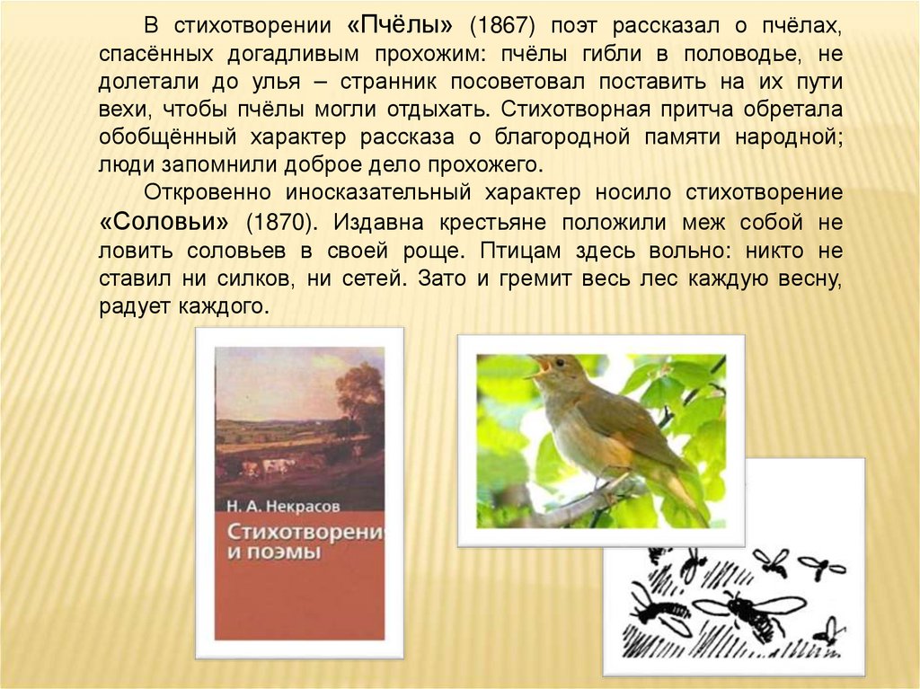 В стихотворении «Пчёлы» (1867) поэт рассказал о пчёлах,спасённых догадливым прохожим: пчёлы гибли в половодье, не