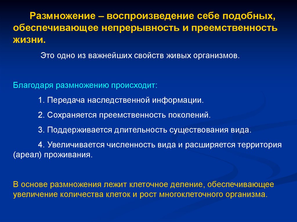 Размножение – воспроизведение себе подобных,обеспечивающее непрерывность и преемственность