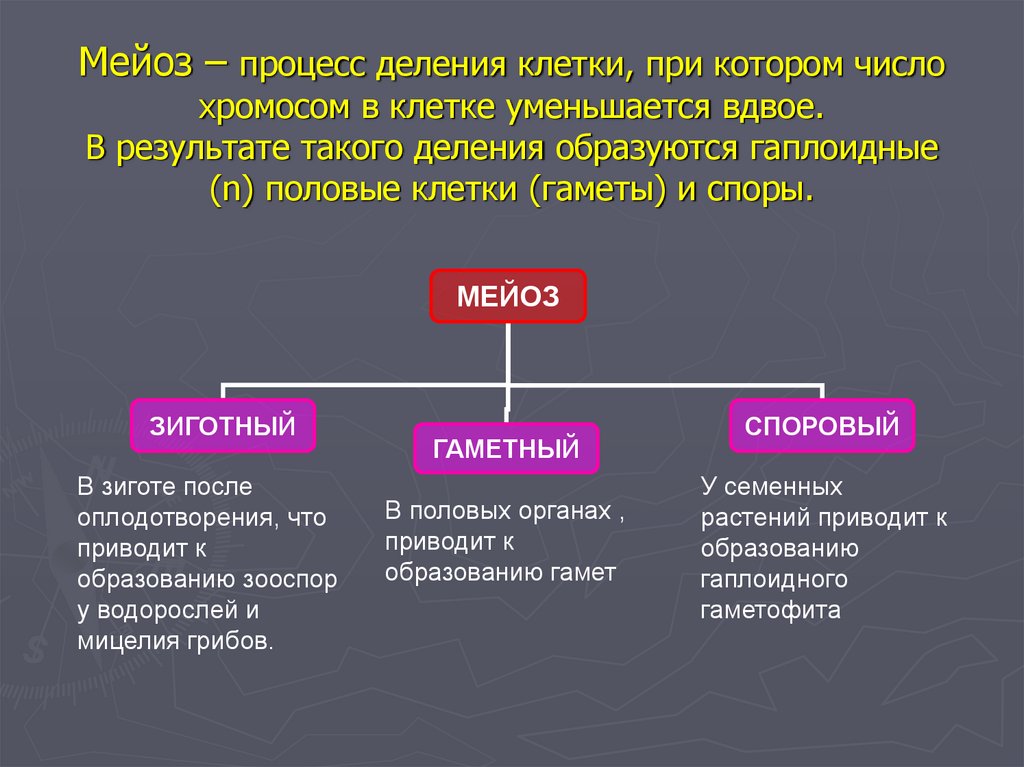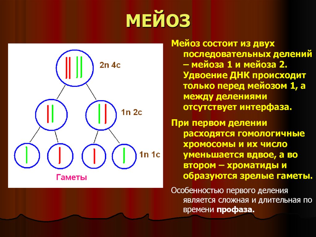 Происходит поддержание числа хромосом из поколения впоколение. Зрелые гаметы получают гаплоидное число (n)