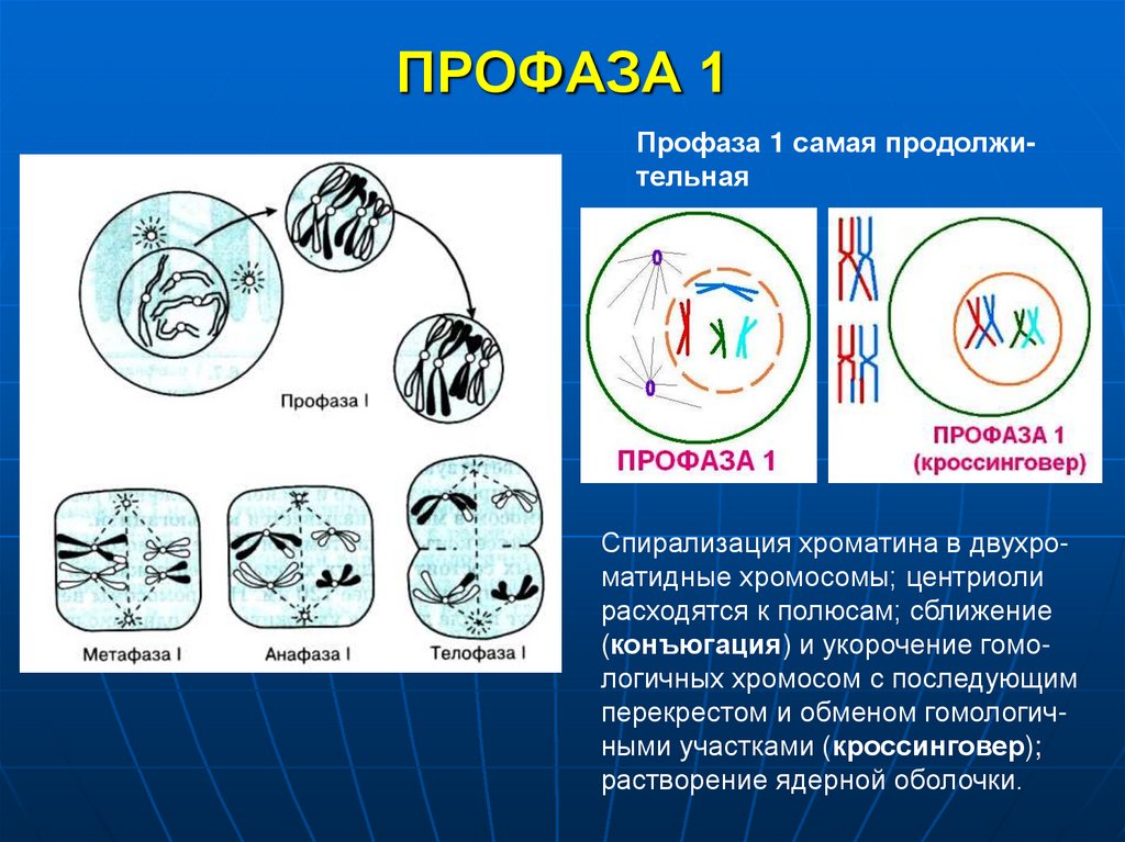 Профаза 1 самая продолжительнаяСпирализация хроматина в двухроматидные хромосомы; центриоли