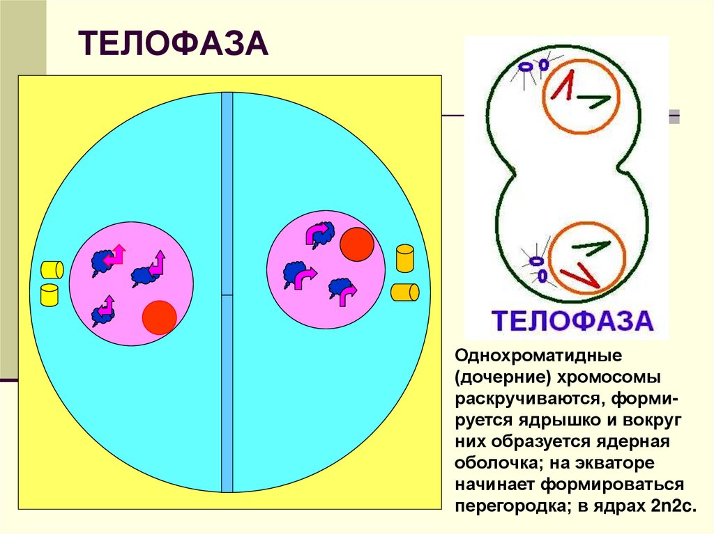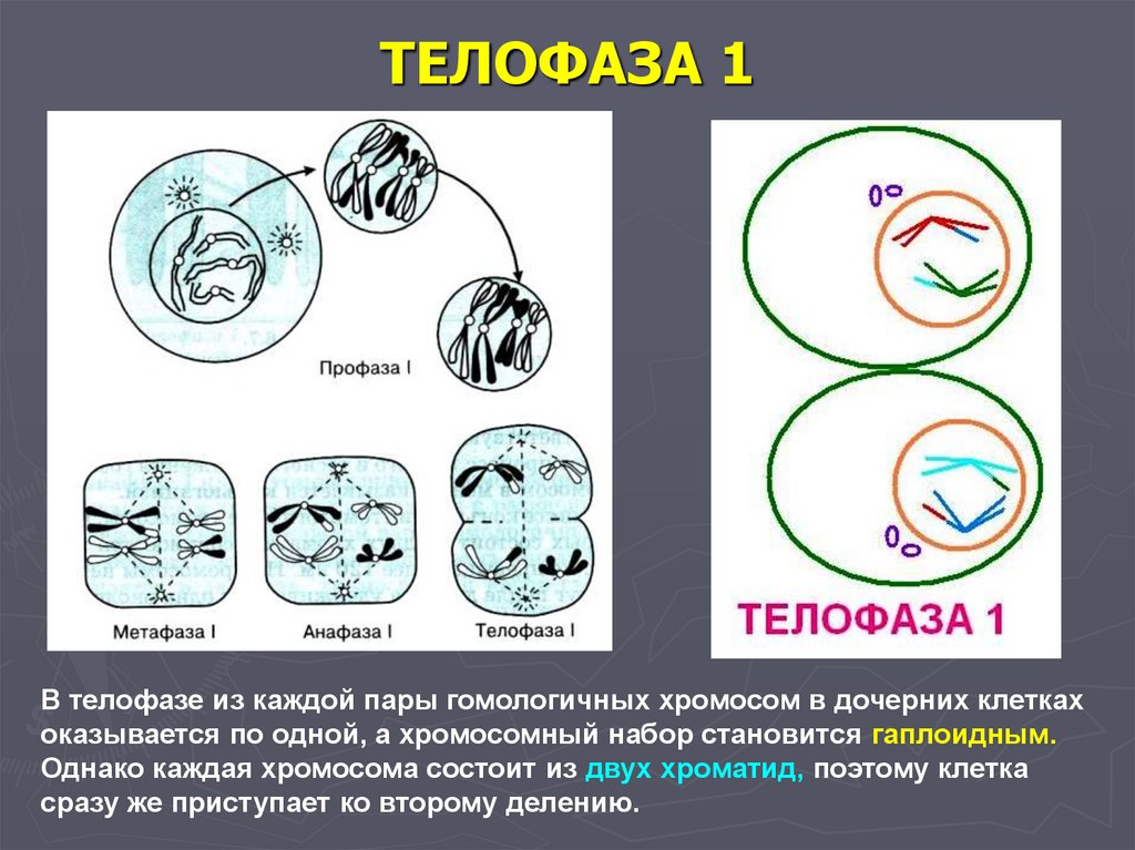 В телофазе из каждой пары гомологичных хромосом в дочерних клеткахоказывается по одной, а хромосомный набор становится гаплоидным.