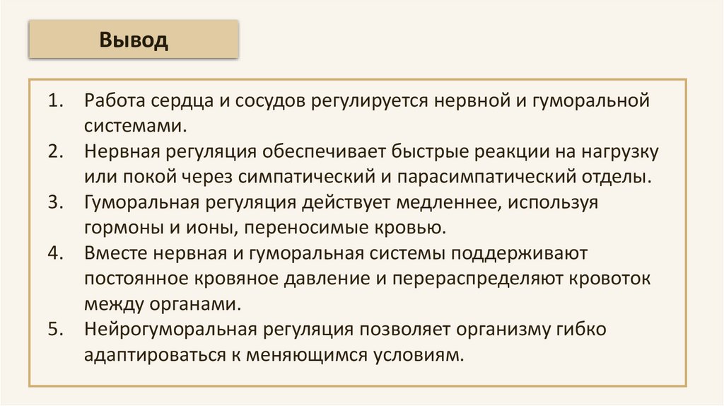 Вывод1. Работа сердца и сосудов регулируется нервной и гуморальной