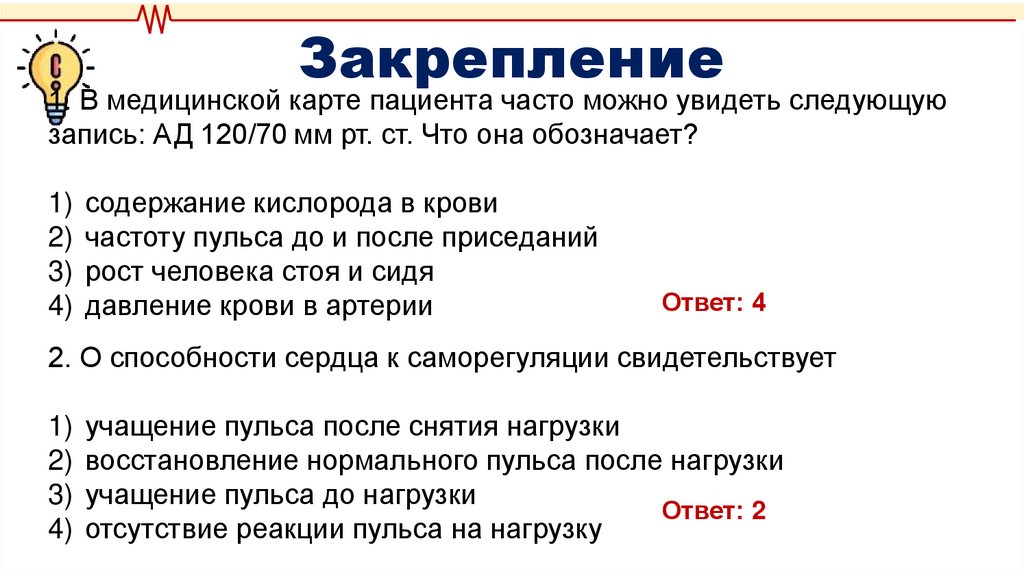 1. В медицинской карте пациента часто можно увидеть следующуюзапись: АД 120/70 мм рт. ст. Что она обозначает?