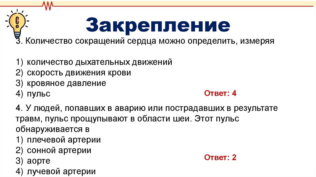 3. Количество сокращений сердца можно определить, измеряя1) количество дыхательных движений