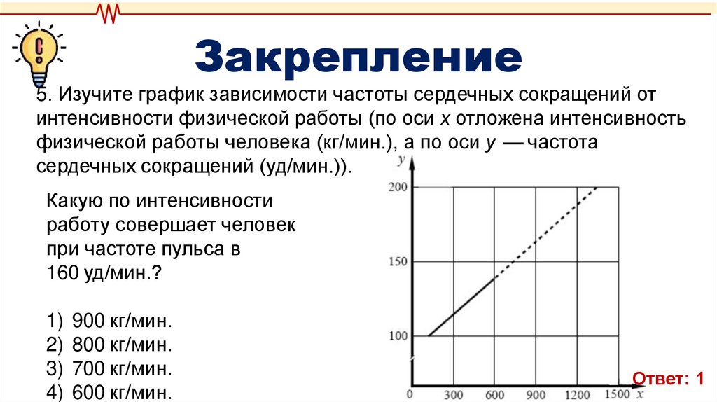 5. Изучите график зависимости частоты сердечных сокращений отинтенсивности физической работы (по оси х отложена интенсивность