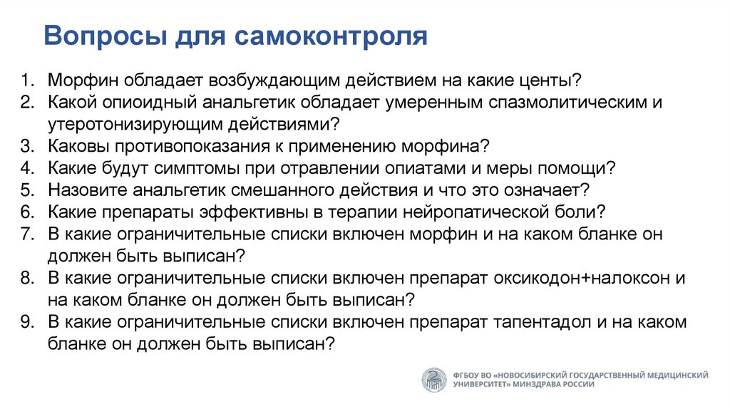 1. Морфин обладает возбуждающим действием на какие центы?2. Какой опиоидный анальгетик обладает умеренным спазмолитическим и