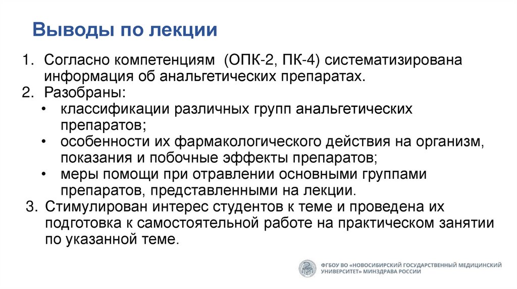1. Согласно компетенциям (ОПК-2, ПК-4) систематизированаинформация об анальгетических препаратах.