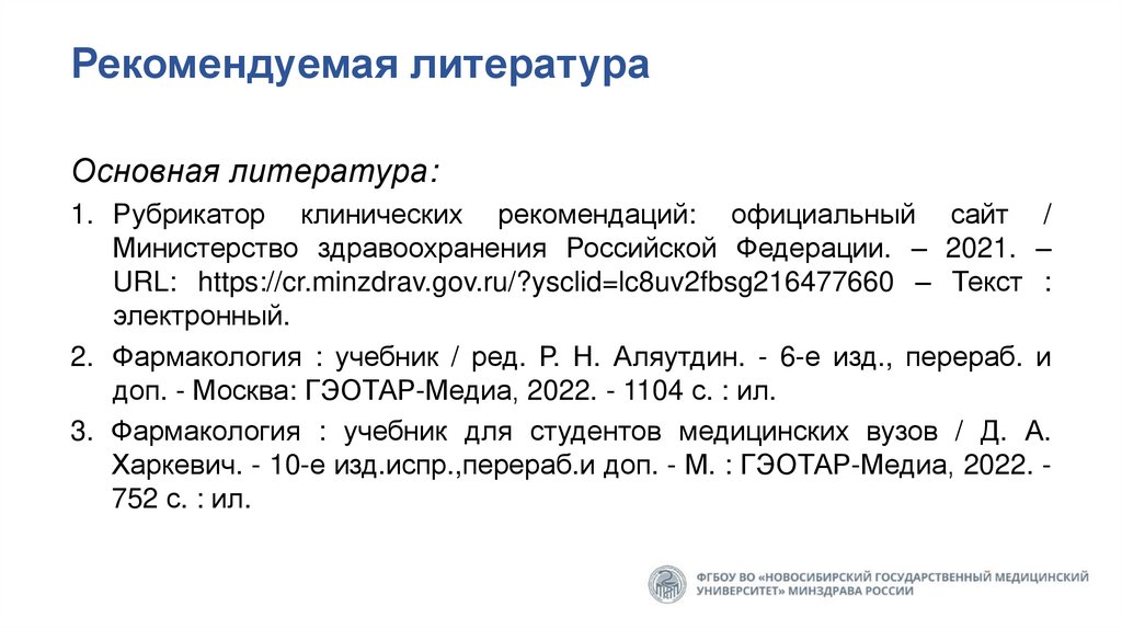 Дополнительная литература:1. Фармакология [Электронный ресурс] : материалы для подготовки к экзамену для студентов 3 курса лечебного факультета / сост. А. Р.