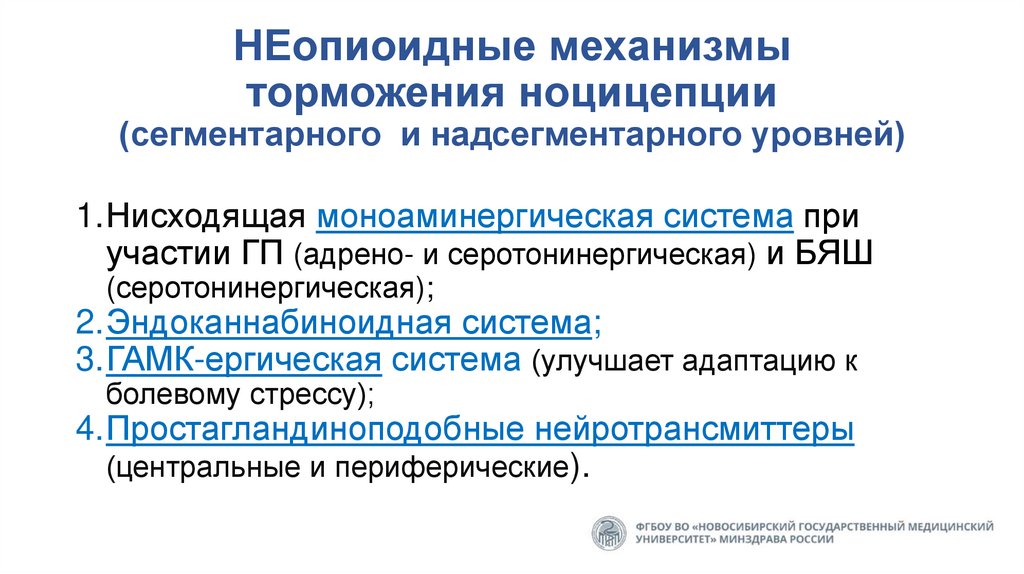 10. НЕопиоидные механизмы торможения ноцицепции (сегментарного и надсегментарного уровней)