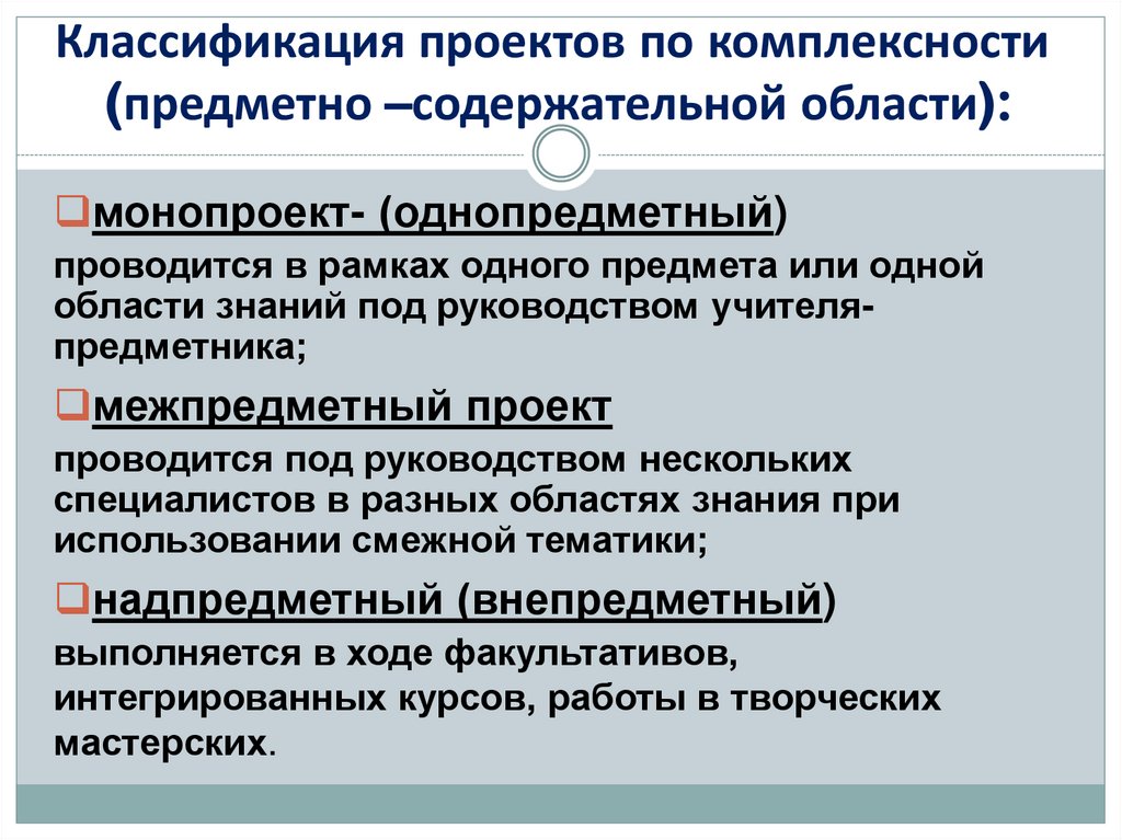 11. Классификация проектов по комплексности (предметно –содержательной области):