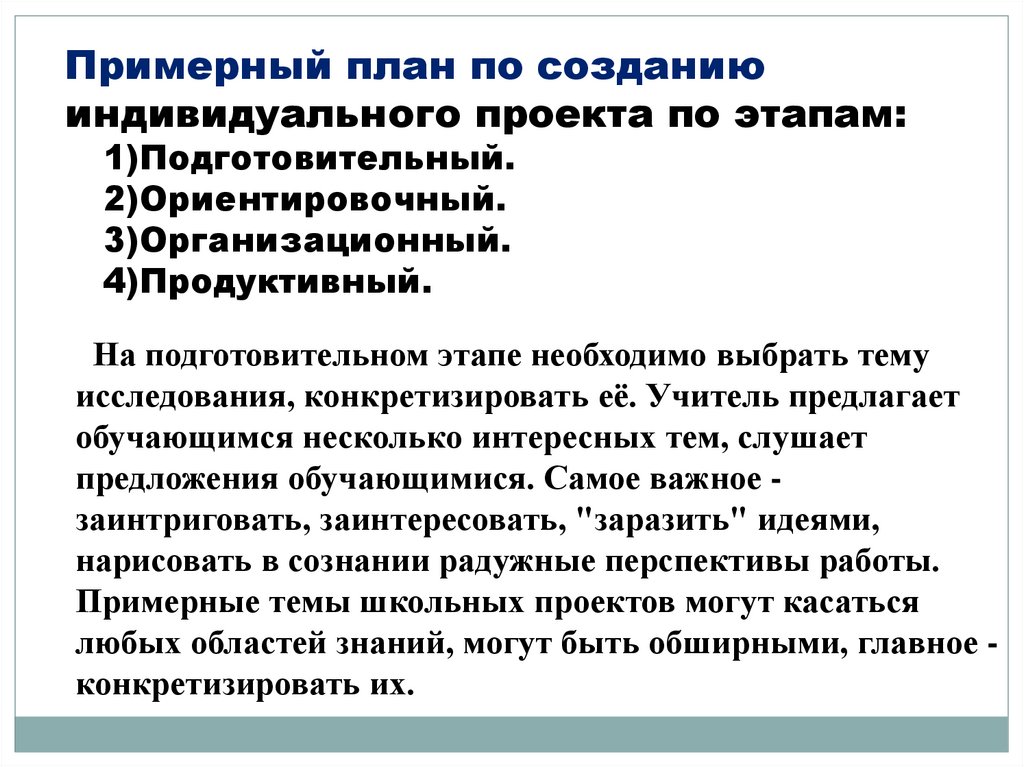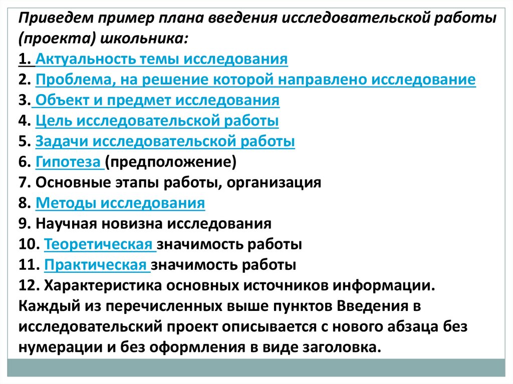 Приведем пример плана введения исследовательской работы(проекта) школьника: