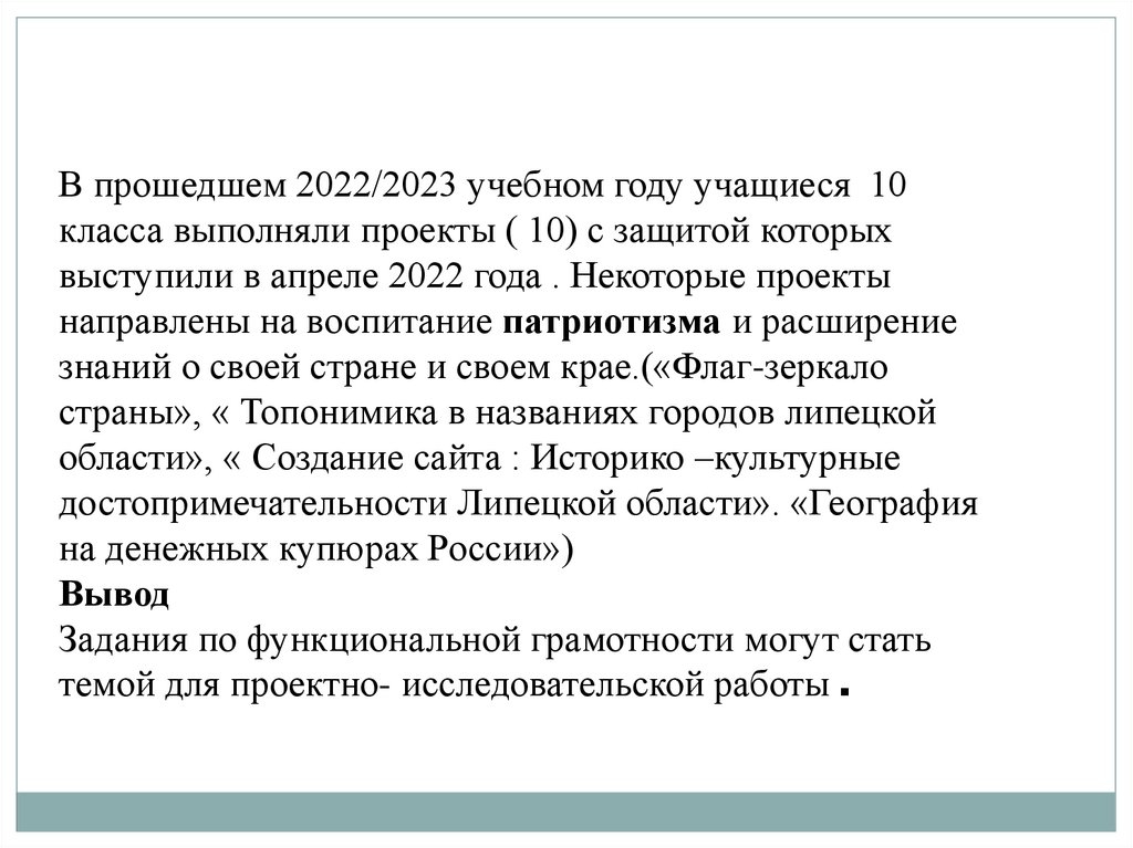 В прошедшем 2022/2023 учебном году учащиеся 10класса выполняли проекты ( 10) с защитой которых