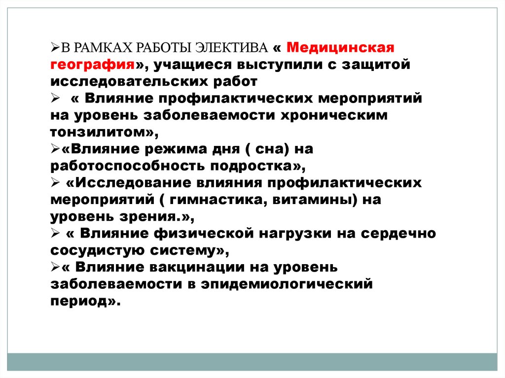 В РАМКАХ РАБОТЫ ЭЛЕКТИВА « Медицинскаягеография», учащиеся выступили с защитой