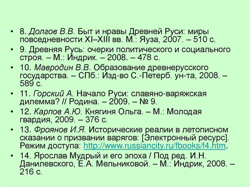 • 8. Долгов В.В. Быт и нравы Древней Руси: мирыповседневности XI–XIII вв. М.: Яуза, 2007. – 510 с.