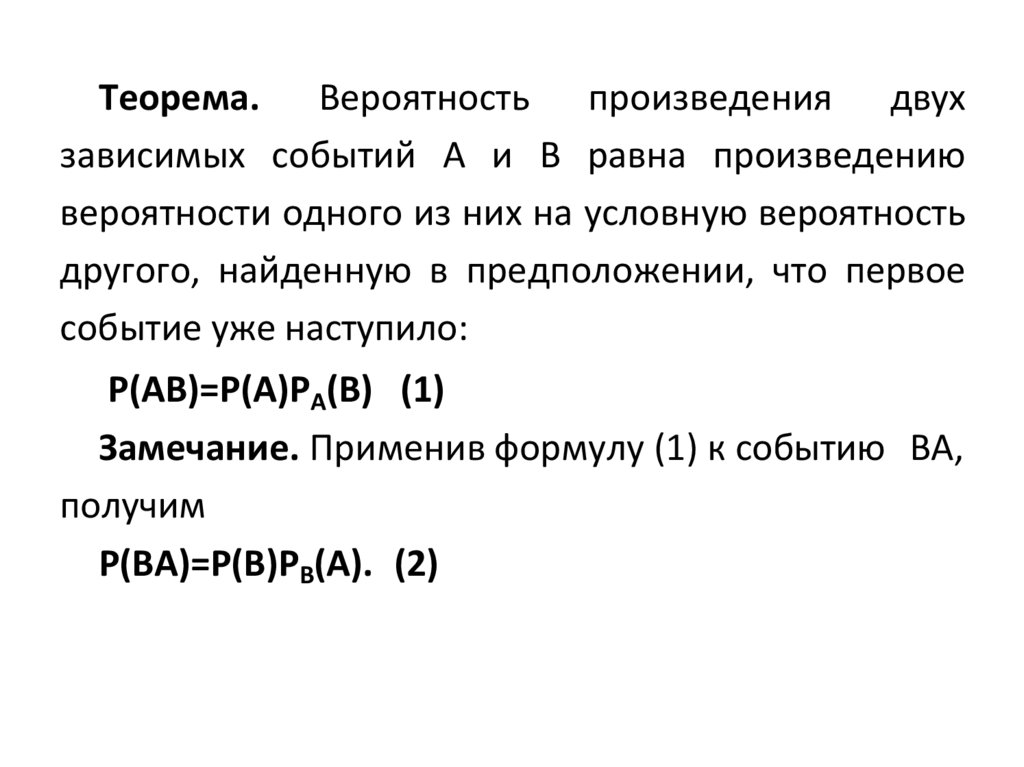 Теорема. Вероятность произведения двухзависимых событий A и B равна произведению