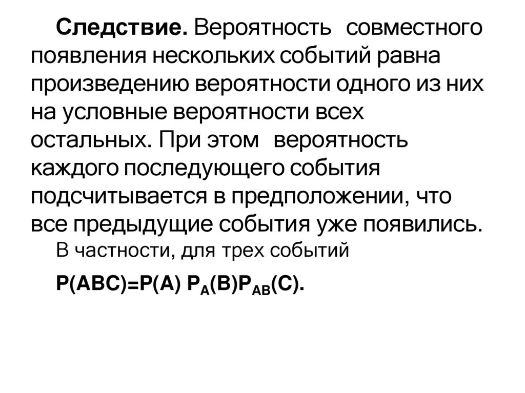 Следствие. Вероятность совместногопоявления нескольких событий равна