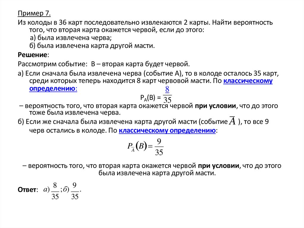 Пример 7.Из колоды в 36 карт последовательно извлекаются 2 карты. Найти вероятность