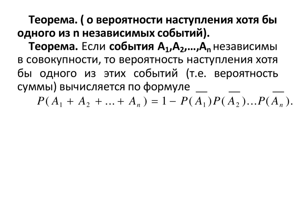 17. Теорема. ( о вероятности наступления хотя бы одного из n независимых событий). Теорема. Если события A1,A2,…,An независимы в