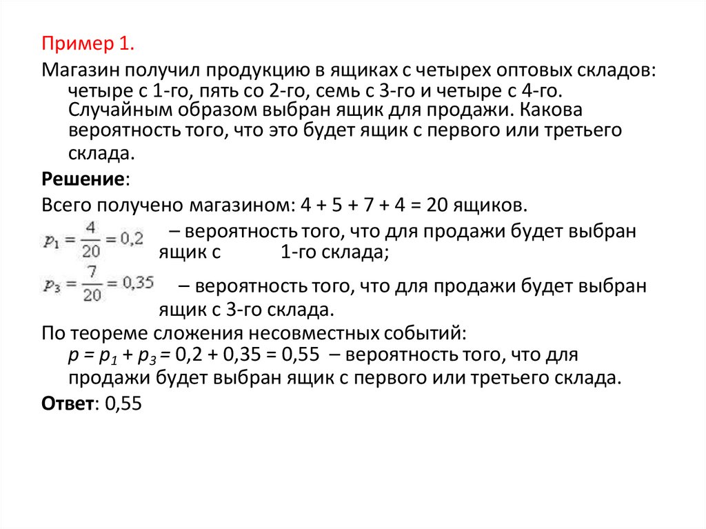 p = p1 + p3 = 0,2 + 0,35 = 0,55 – вероятность того, что для