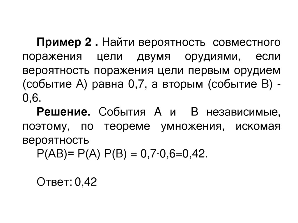 Пример 2 . Найти вероятность совместногопоражения цели двумя орудиями, если