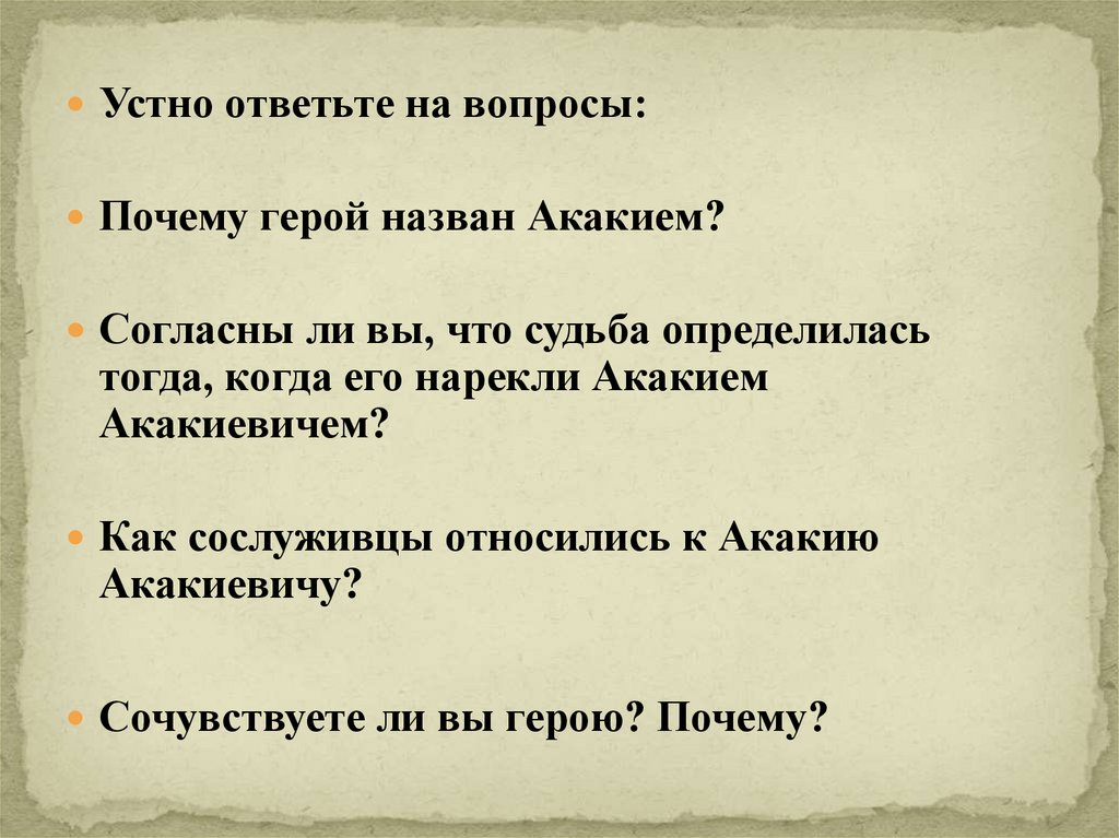 Устно ответьте на вопросы:Почему герой назван Акакием?
