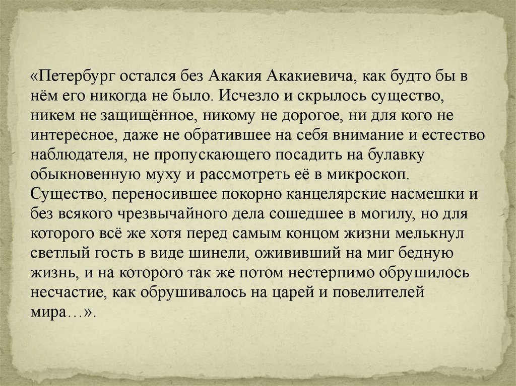 «Петербург остался без Акакия Акакиевича, как будто бы внём его никогда не было. Исчезло и скрылось существо,