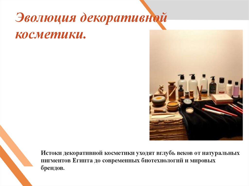 Истоки декоративной косметики уходят вглубь веков от натуральныхпигментов Египта до современных биотехнологий и мировых