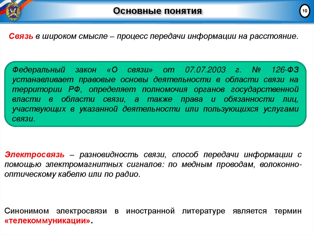 Связь в широком смысле – процесс передачи информации на расстояние.Федеральный закон «О связи» от 07.07.2003 г. № 126-ФЗ