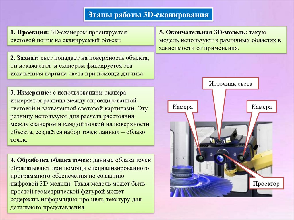 Этапы работы 3D-сканирования1. Проекция: 3D-сканером проецируется