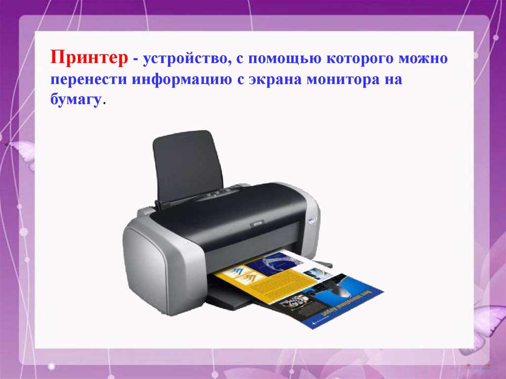 Принтер - устройство, с помощью которого можноперенести информацию с экрана монитора на