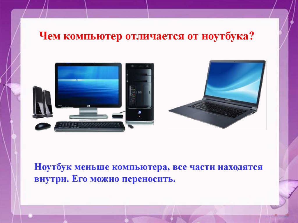 Чем компьютер отличается от ноутбука?Ноутбук меньше компьютера, все части находятся