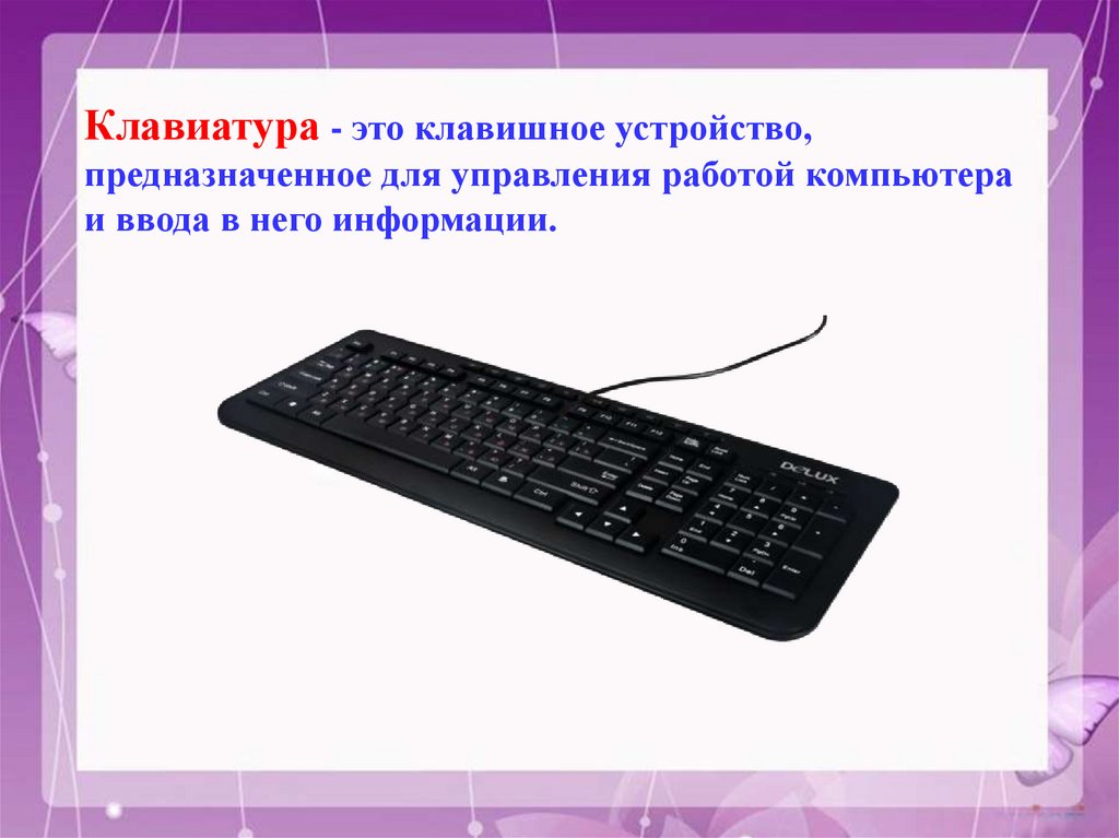 Клавиатура - это клавишное устройство,предназначенное для управления работой компьютера
