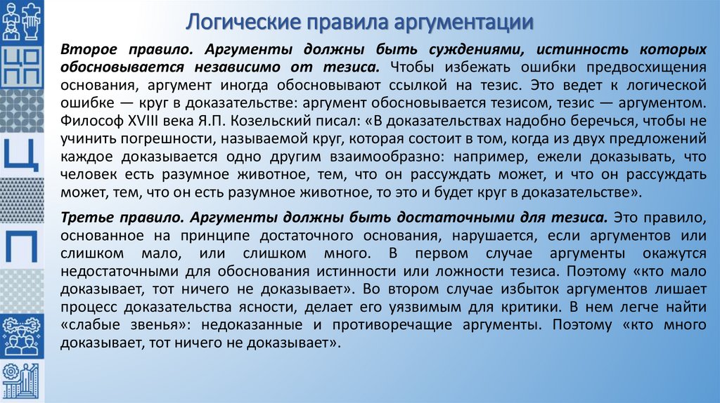 Только соблюдая основные правила аргументирования, можно успешно пользоваться чисто техническими приемами ведения дискуссии и полемики:• В ходе аргументации пользуйтесь только теми аргументами, которые вы и ваш оппонент