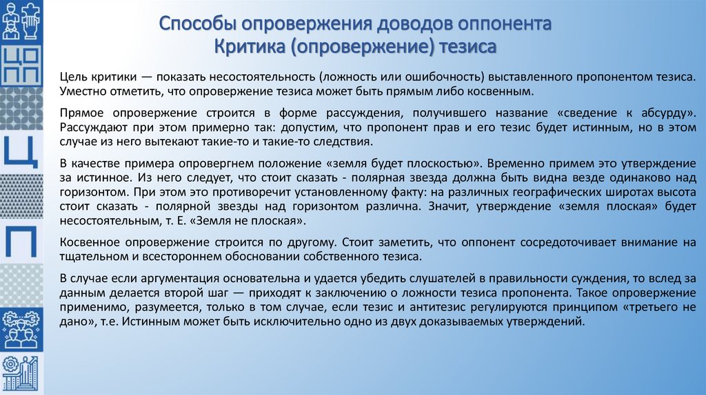 Цель критики — показать несостоятельность (ложность или ошибочность) выставленного пропонентом тезиса.Уместно отметить, что опровержение тезиса может быть прямым либо косвенным.
