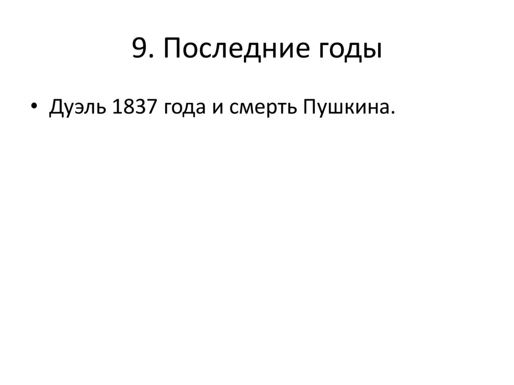 9. Последние годы• Дуэль 1837 года и смерть Пушкина.