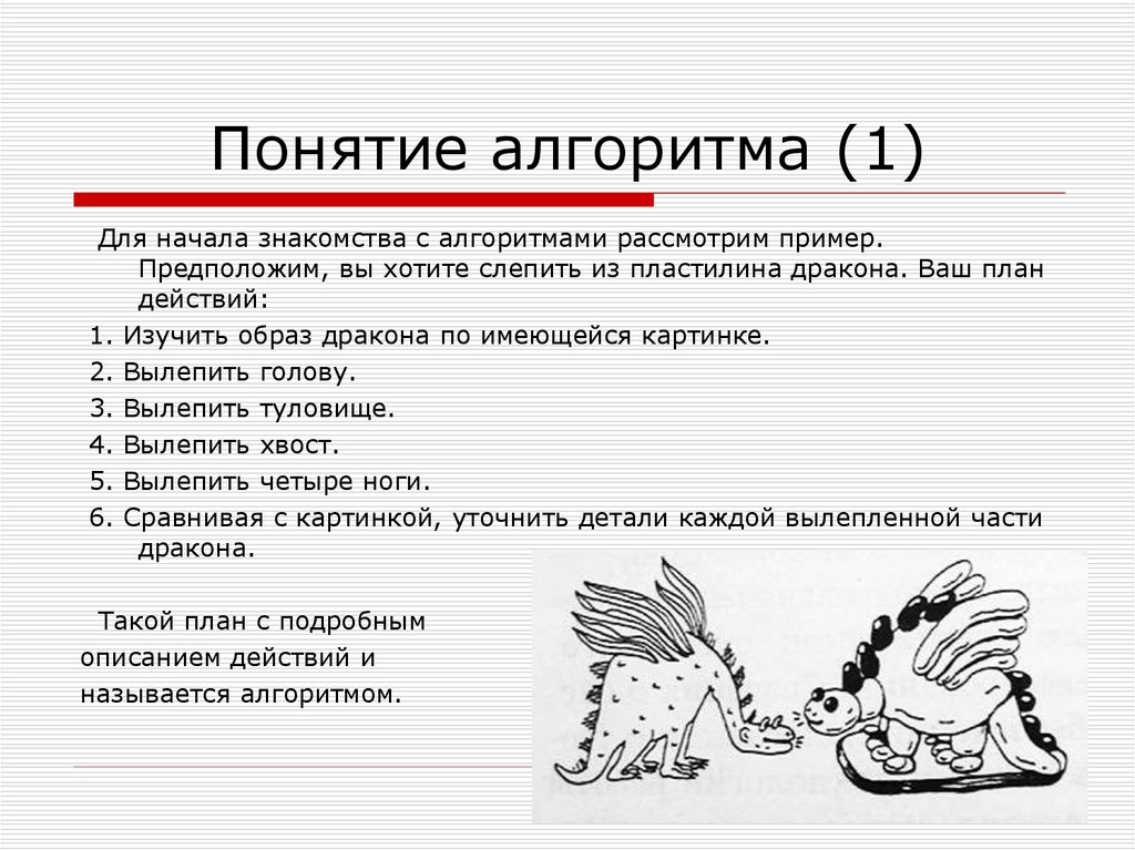 Для начала знакомства с алгоритмами рассмотрим пример.Предположим, вы хотите слепить из пластилина дракона. Ваш план