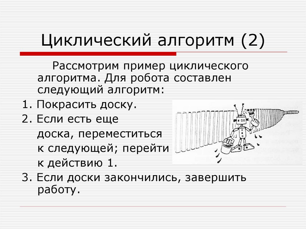Рассмотрим пример циклическогоалгоритма. Для робота составлен