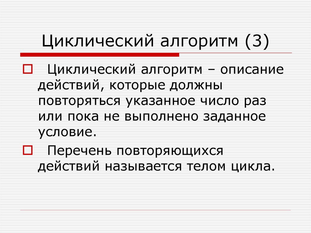 Циклический алгоритм – описаниедействий, которые должны