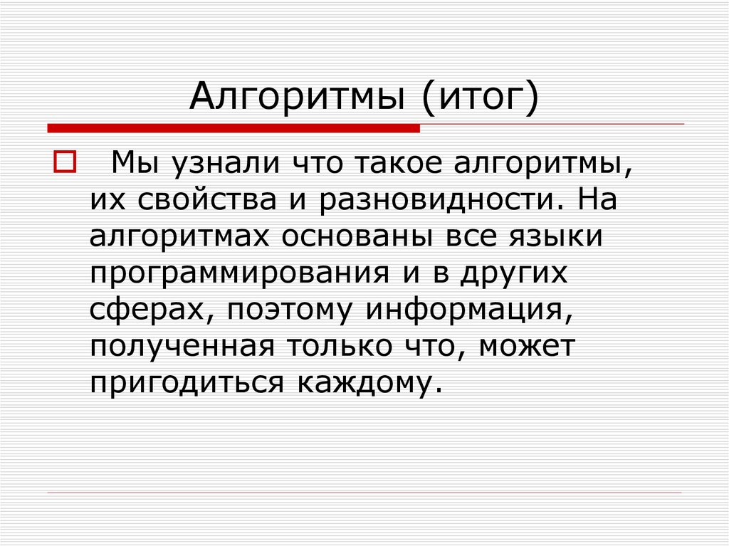 Мы узнали что такое алгоритмы,их свойства и разновидности. На