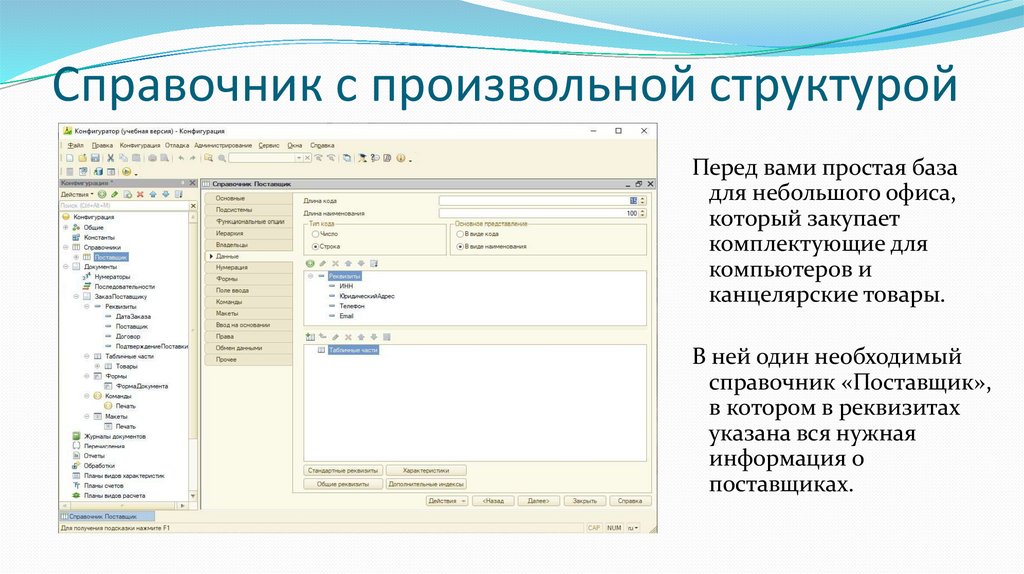 – Разработать один справочник с произвольной структурой.