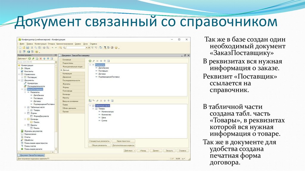 – Разработать один документ, связанный со справочником.