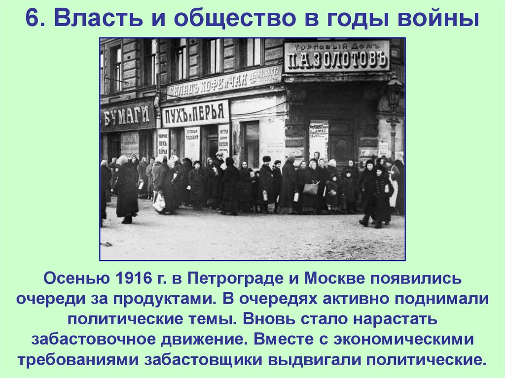 Осенью 1916 г. в Петрограде и Москве появилисьочереди за продуктами. В очередях активно поднимали