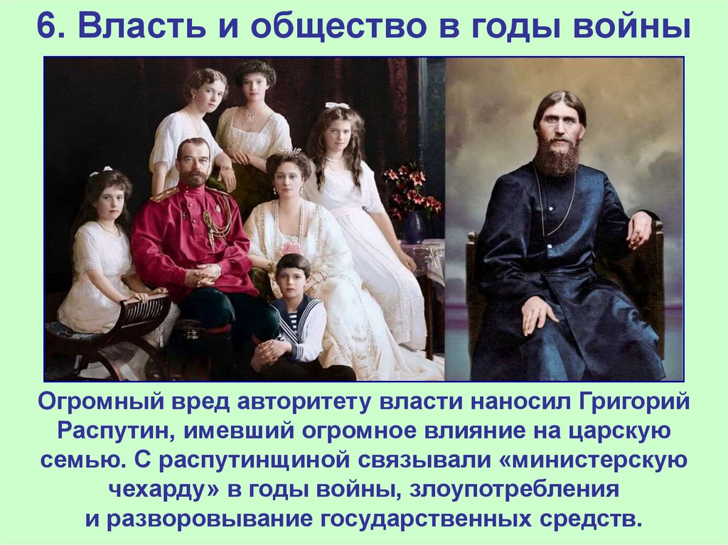 Огромный вред авторитету власти наносил ГригорийРаспутин, имевший огромное влияние на царскую