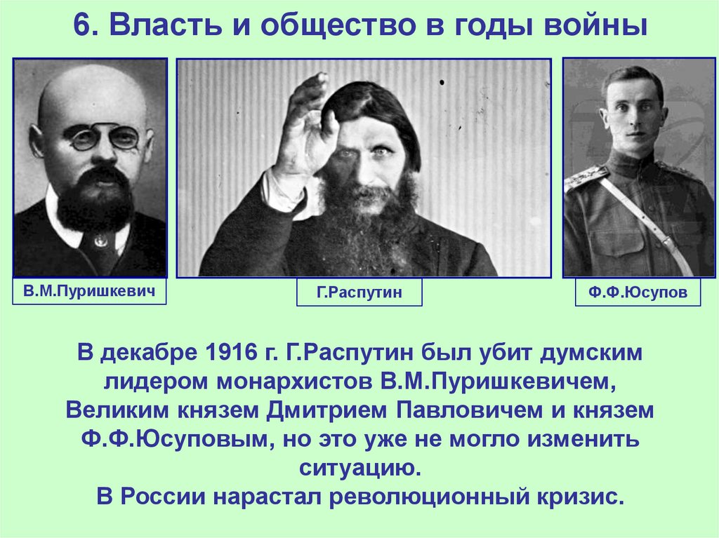 В декабре 1916 г. Г.Распутин был убит думским
