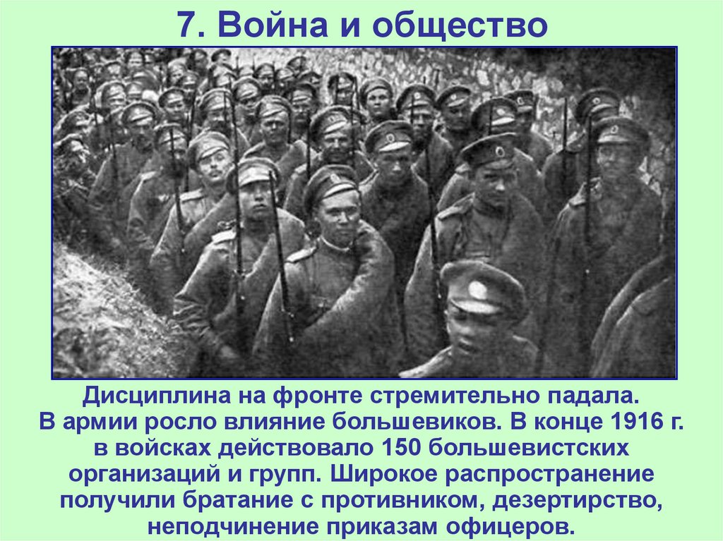 Дисциплина на фронте стремительно падала.В армии росло влияние большевиков. В конце 1916 г.