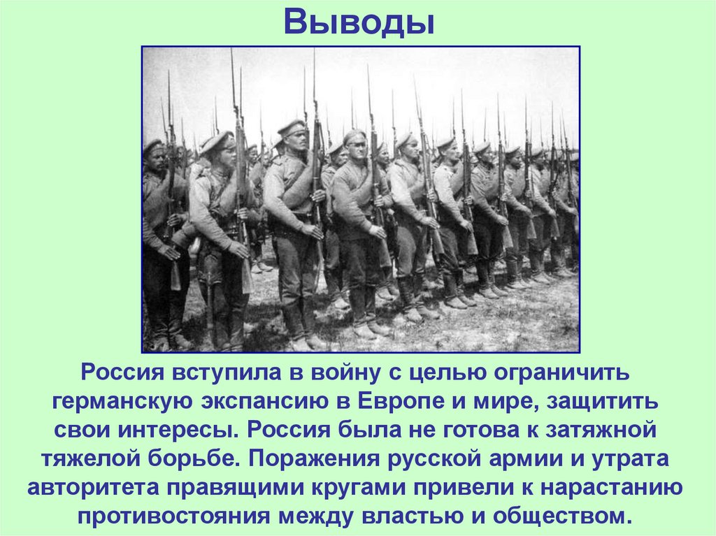 Россия вступила в войну с целью ограничитьгерманскую экспансию в Европе и мире, защитить
